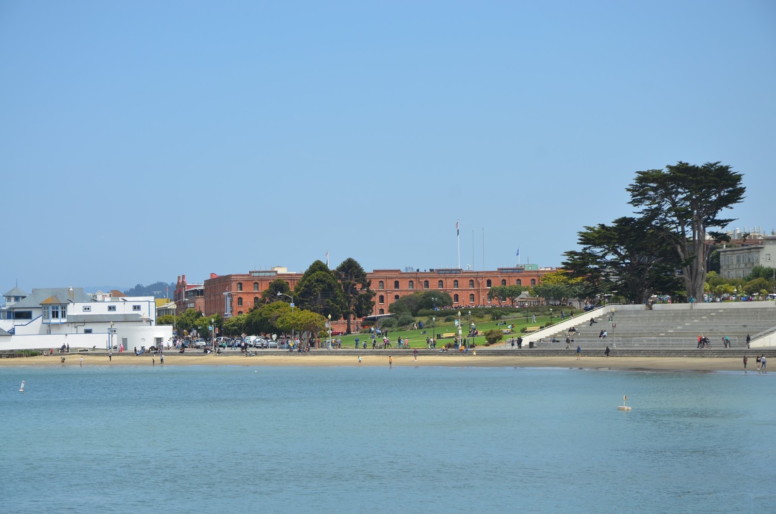 Continue along the bay towards east, pass Crissy Field (4), a former military airfield, and enjoy the stunning scenery, the bridge on one side, the approaching city on the other one. When you reach the Aquatic Park (5),